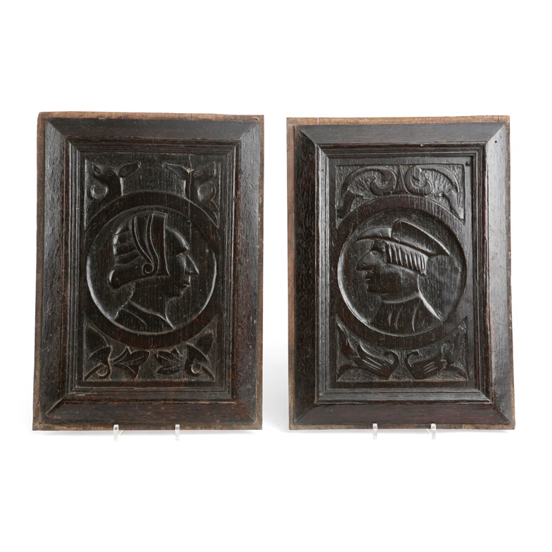 each carved with a profile bust, one male, one female, in a rondel inside moulded frames (2)