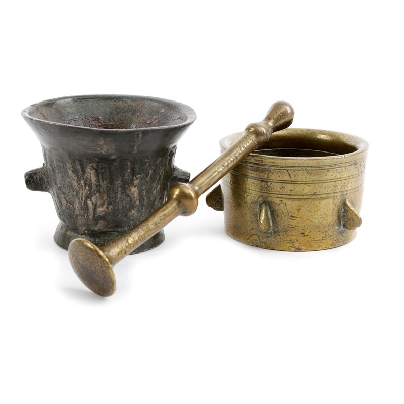 with the initials 'I' and 'B' to the rim, the body cast with foliage between two ribbed lug handles, together with a Spanish bronze mortar with five fins and a probably original pestle with a central knop (3)