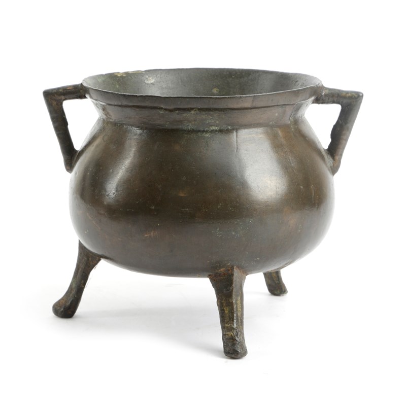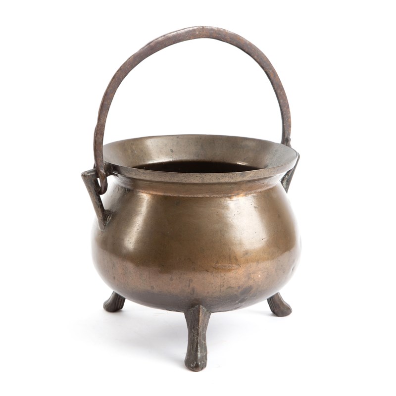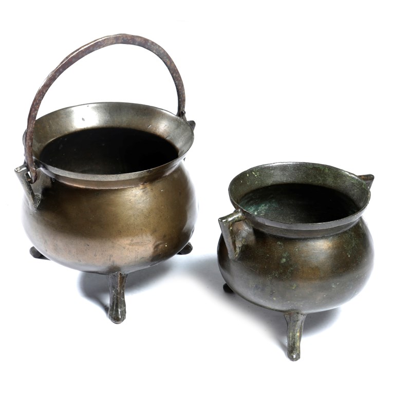 the bulbous body with a flared rim, three reeded legs and a wrought iron swing handle, and another similar but smaller and with no swing handle (2)