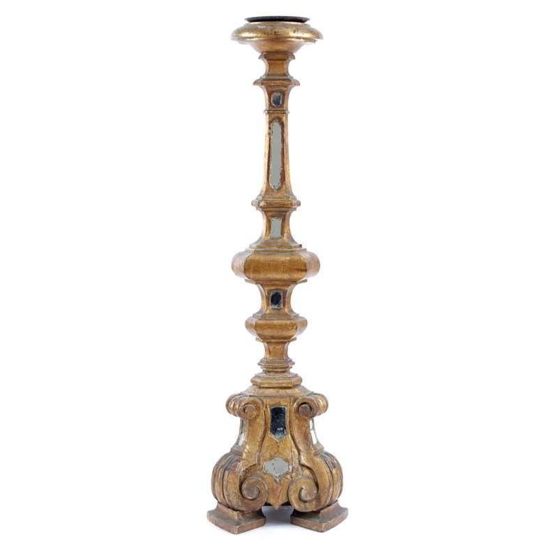 AN ITALIAN GILTWOOD AND MIRROR-INSET PRICKET CANDLESTICK