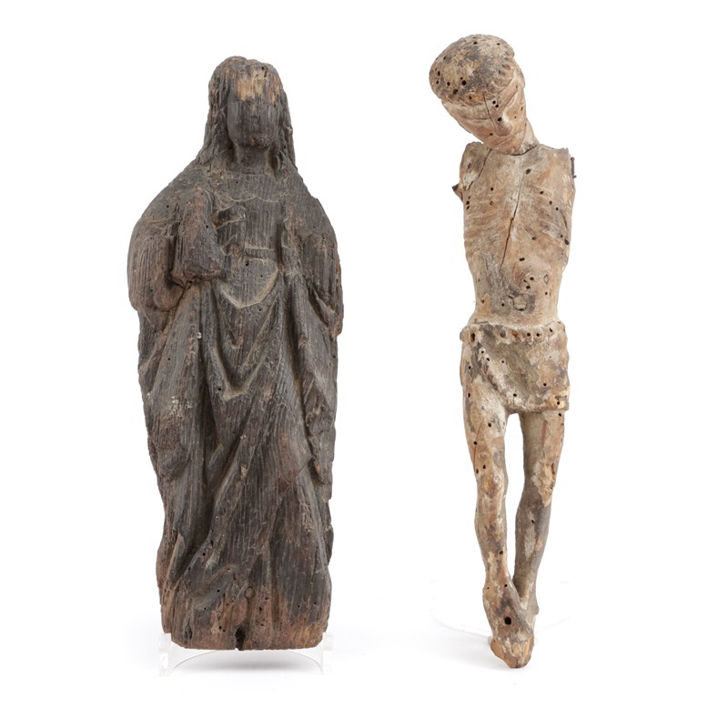 with remains of painted decoration, together with a late Medieval oak figure of a lady with plaited hair (2)