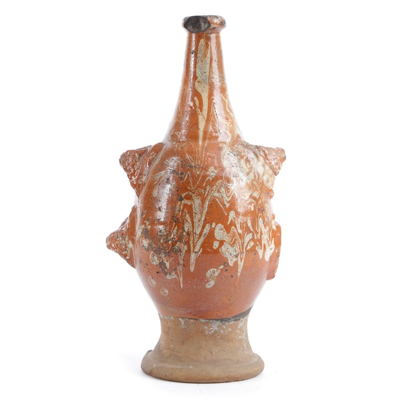 of footed teardrop form with two pairs of loops, under a cream and terracotta marbled glaze