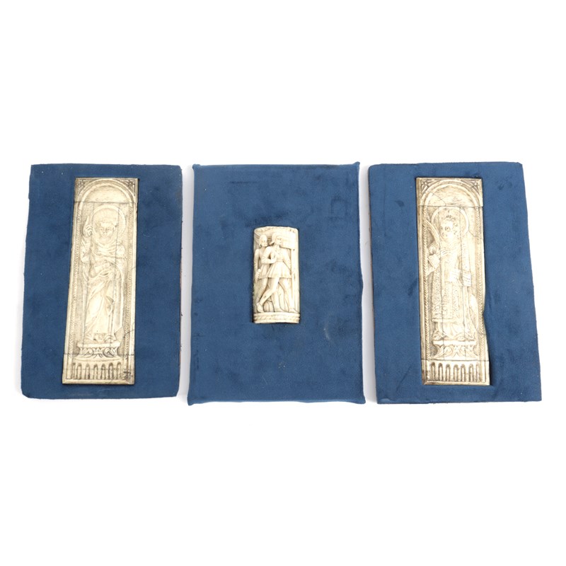each standing under a round arch and on a low foliate pedestal, together with another bone panel of a similar period, French or Italian, carved with two soldiers, one carrying a banner, the other a sword (3)