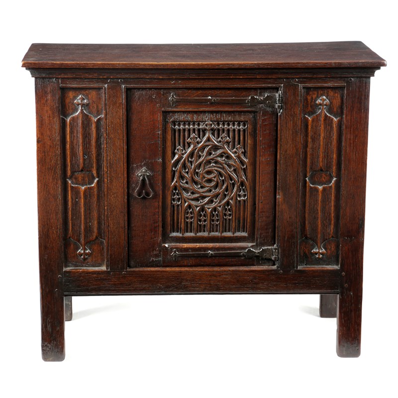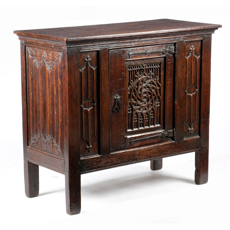 the central cupboard door inset with a carved Gothic panel flanked by outer linenfold panels, the sides with conforming decoration