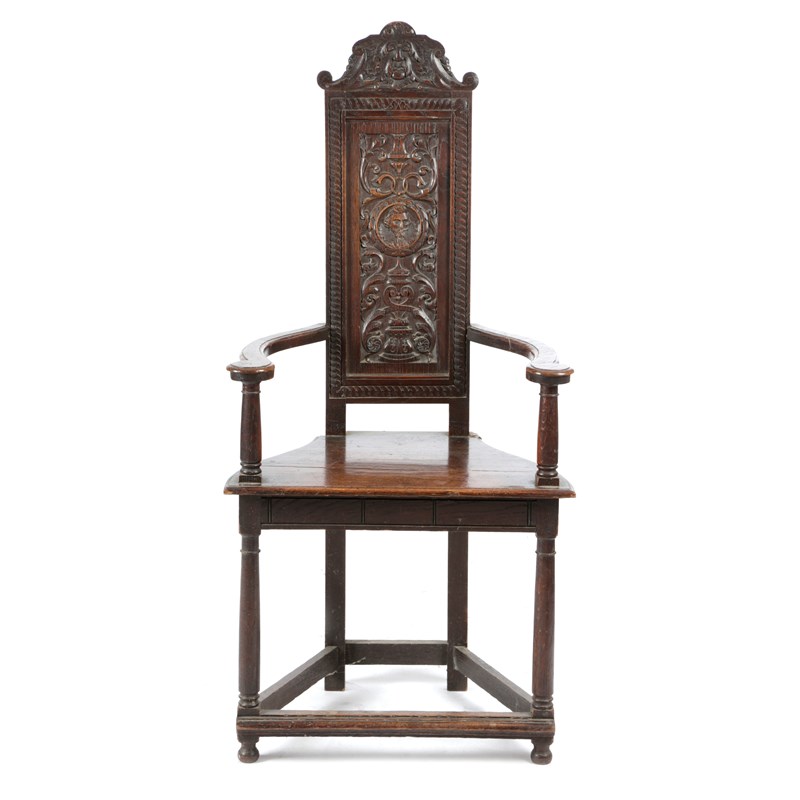 the back panel carved with grotesques and portrait rondel with scroll arms and a tapering seat
