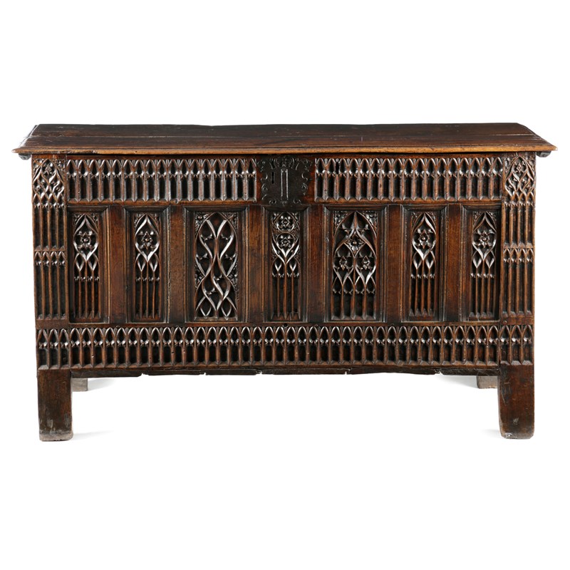 with a moulded top, above a seven panel front, each panel carved with Gothic tracery and leafy buds, the original lockplate with dragon heads and topped with a crown, the sides and rear of panelled construction