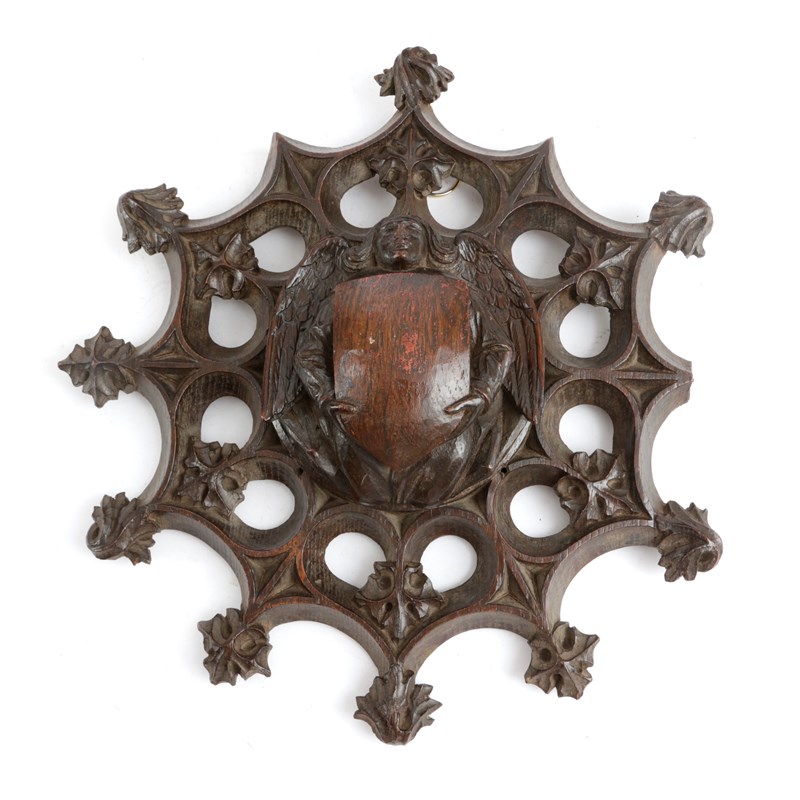 with traces of polychrome, centred by an angel holding a vacant shield, within a radiating carved and pierced tracery surround, with triform leaves and leafy terminals