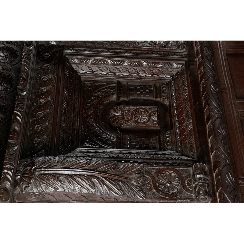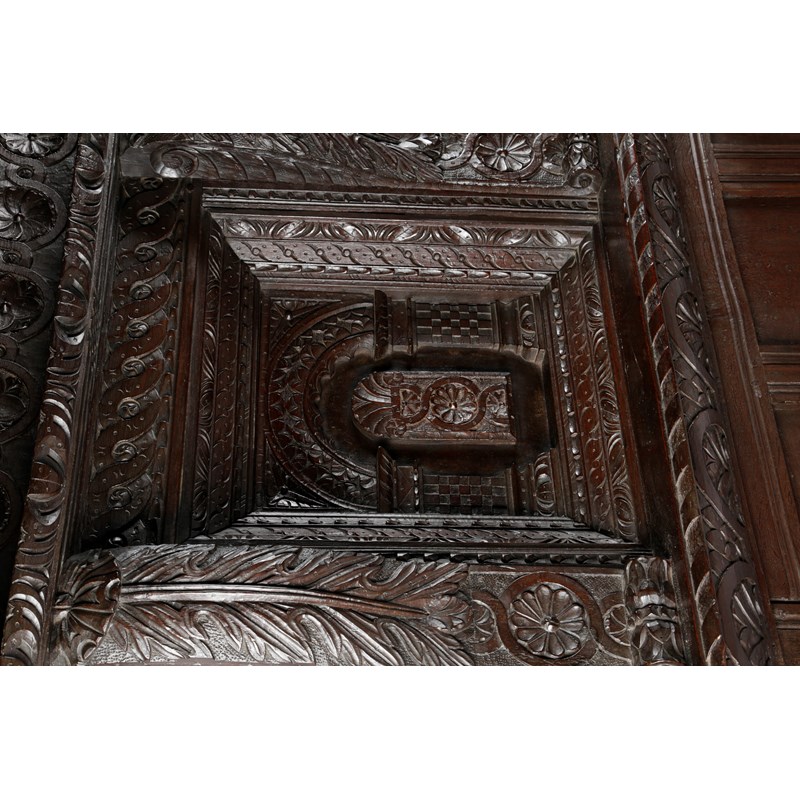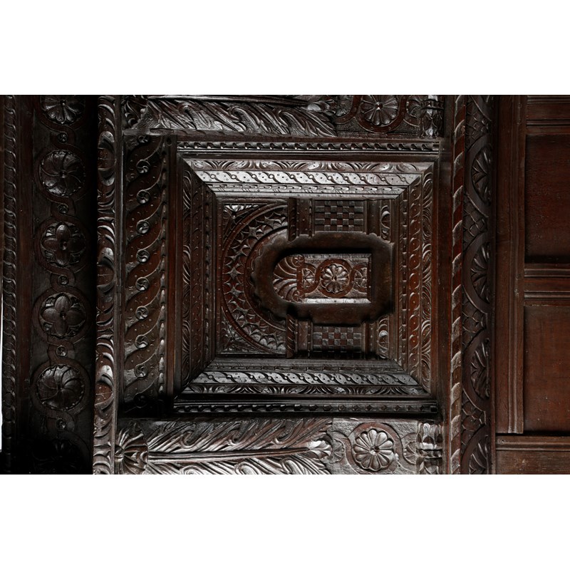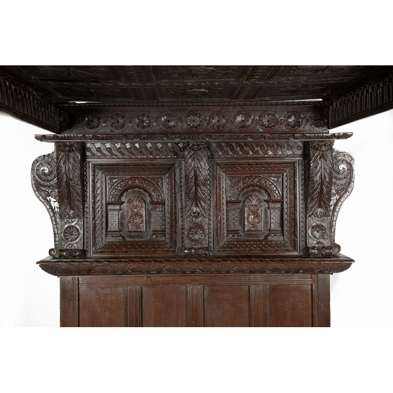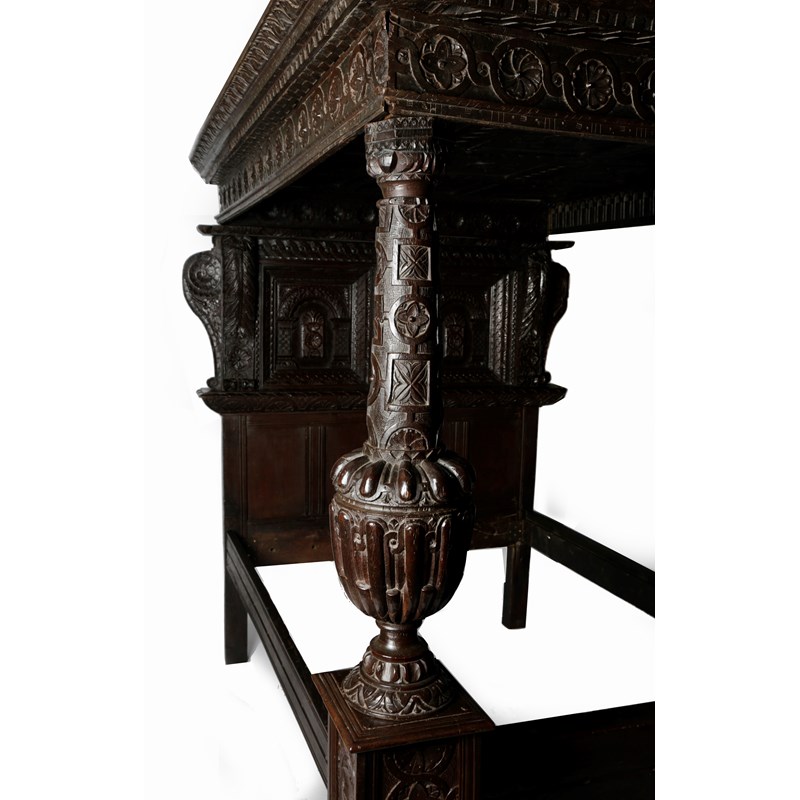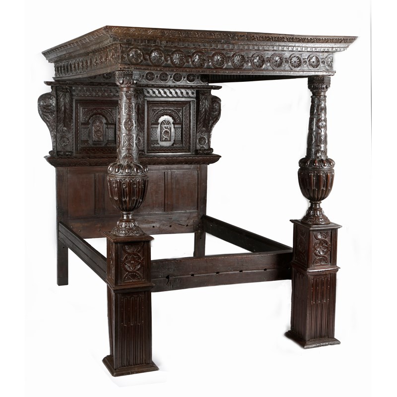 One of the most complete Elizabethan beds recorded, the panelled tester carved with flowerheads set within guilloche carved rails, with the design repeated on the cornice and frieze, the headboard with a pair of recessed arcaded panels centred and flanked by acanthus carved uprights, the whole flanked by scroll and flowerhead carved ears, the substantial end posts carved with jewelled strapwork, above gadrooned cup and cover turning, the plinths flowerhead and nulled carved