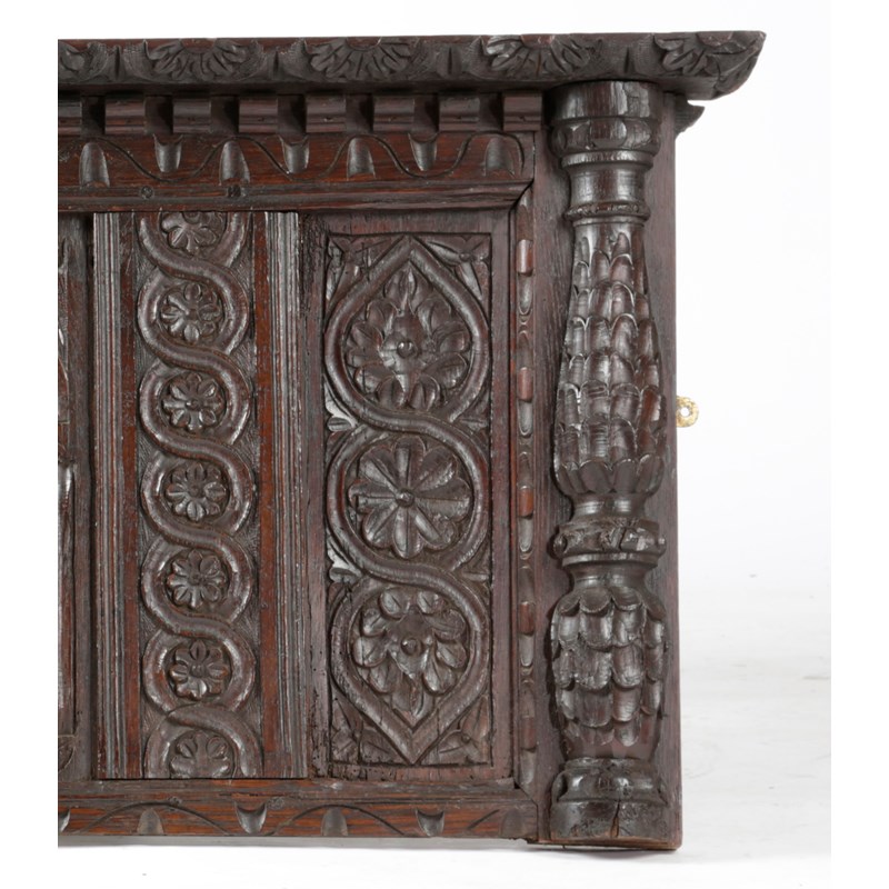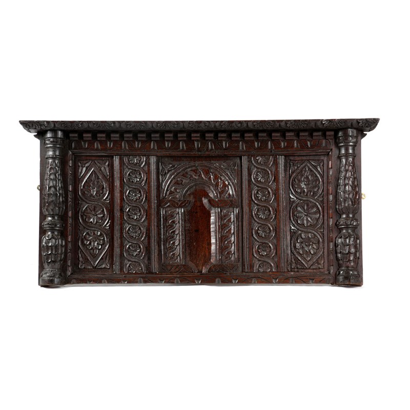 historically constructed in part from a period coffer front, the central panel carved with a guilloche filled arch, flanked by flowerhead guilloche carved uprights, and slender floral interlaced carved panels, below a dentil moulded shelf, the whole with end gauge carved split pilasters