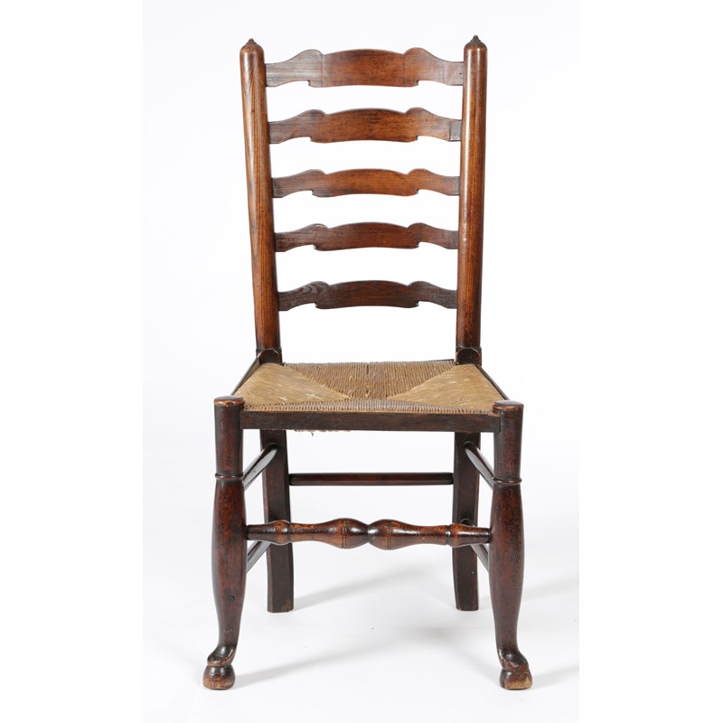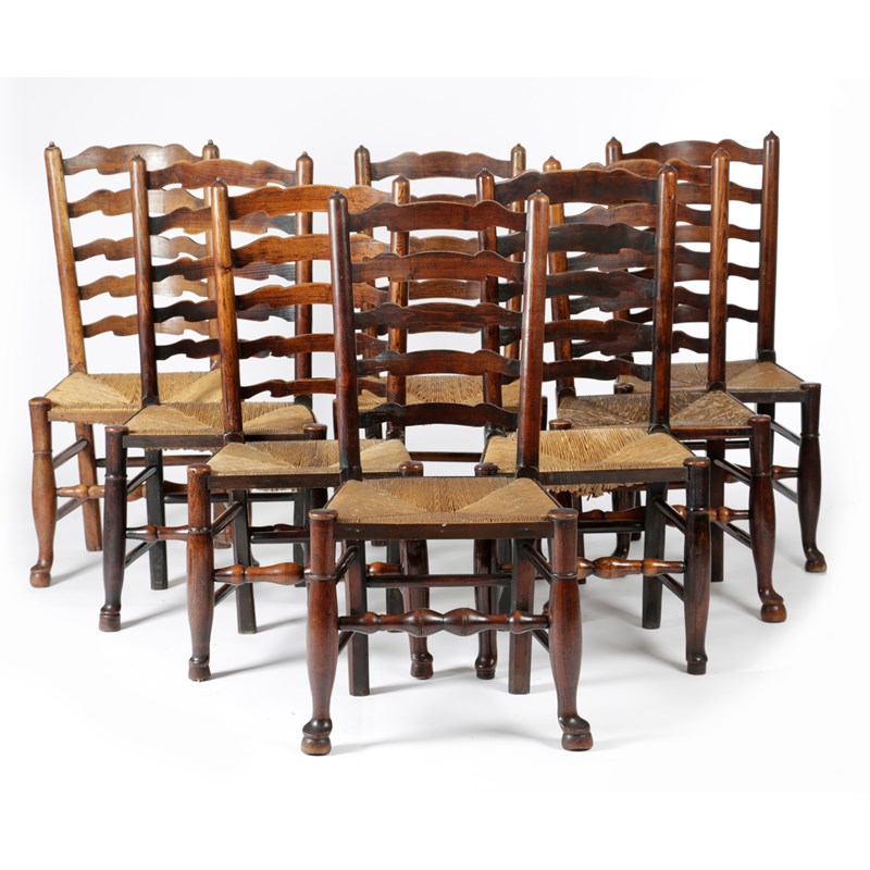 A HARLEQUIN SET OF EIGHT ASH LADDER BACK DINING CHAIRS