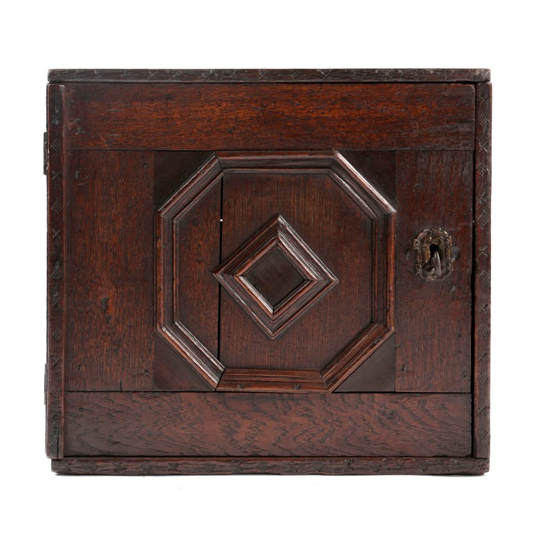 the panelled single door with geometric mitre mouldings, the boarded sides with punch decorated front edge, formerly fitted with small spice drawers