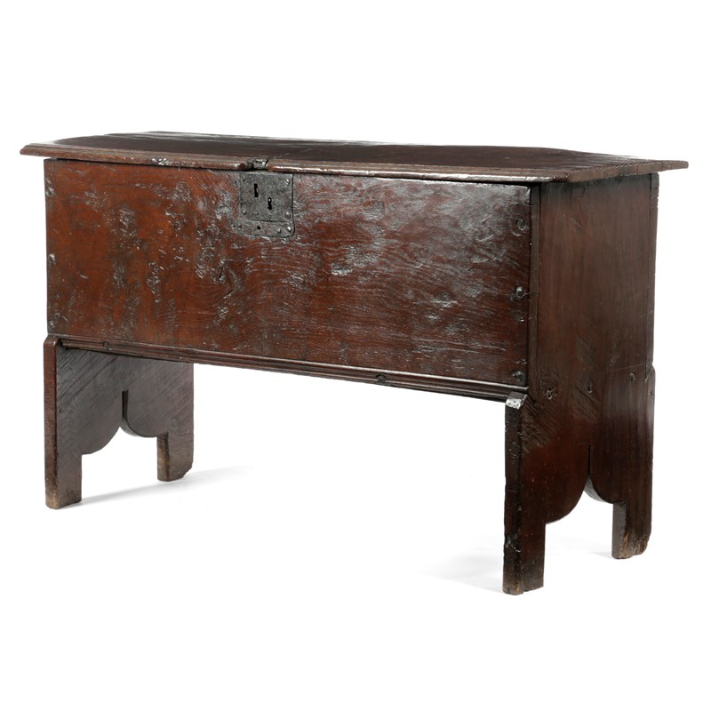 constructed using one-piece thick boards, the lid with a moulded front edge and chip-carved ends, the lower corners of the front and rear boards cut into the end supports which project below the base board and terminate in a 'V' shaped cut-away with high apex detail