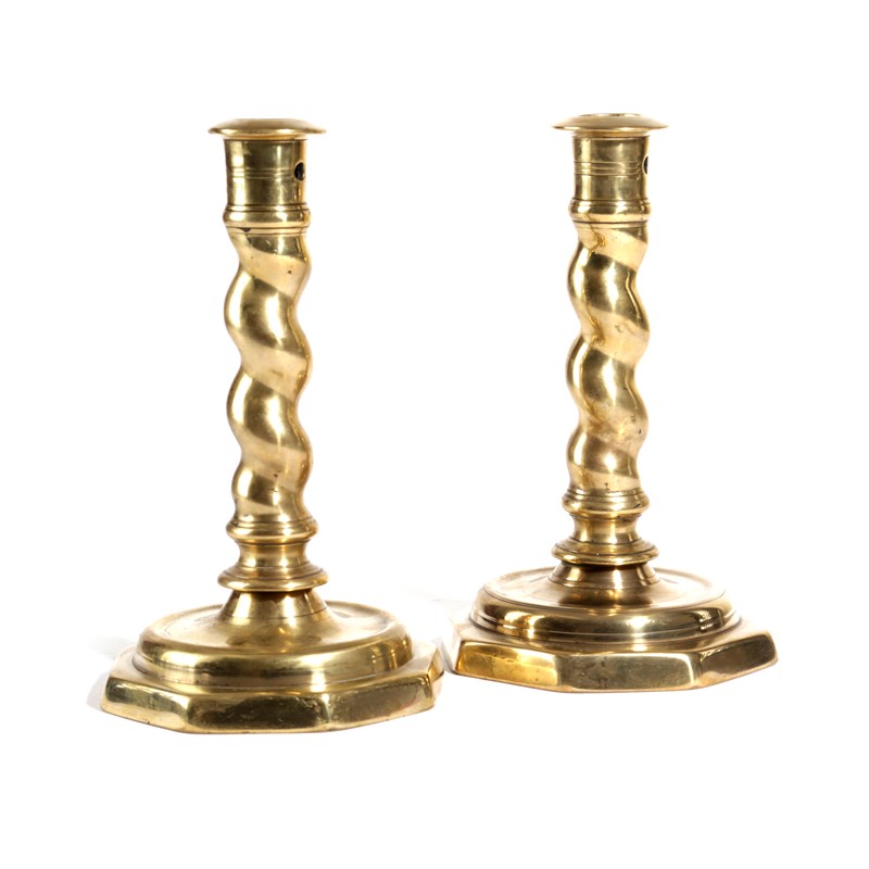 each heavily cast, having a Solomonic pillar, a cylindrical socket with circular pierced extraction hole and a downswept flange, on a stepped circular dished and octagonal foot (2)