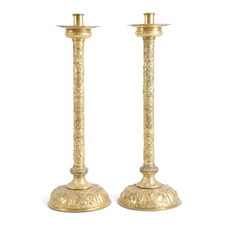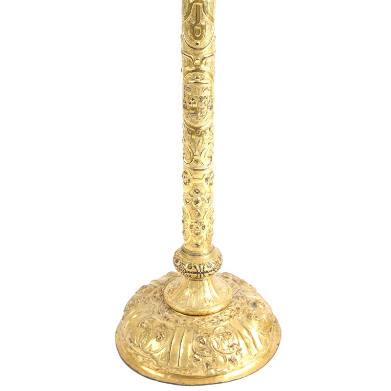 each with a cylindrical socket above an urn shaped drip-pan, cylindrical column and domed foot, embossed with a coat of arms surrounded by Renaissance style strapwork and foliage (2)