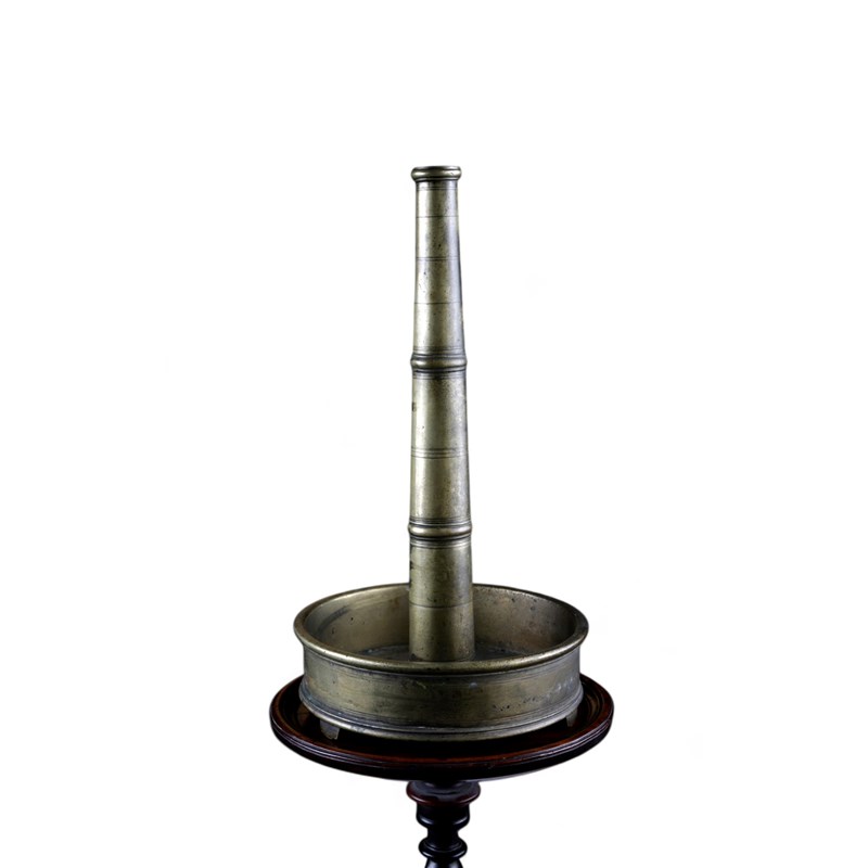 the gun barrel stem with engraved lines and shallow knops on a broad, circular base with raised sides and on short feet