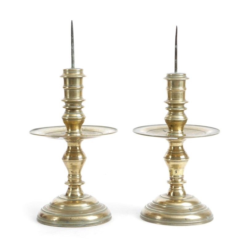 each with a pricket above a ring turned stem and a shallow drip-pan above a domed foot (2)