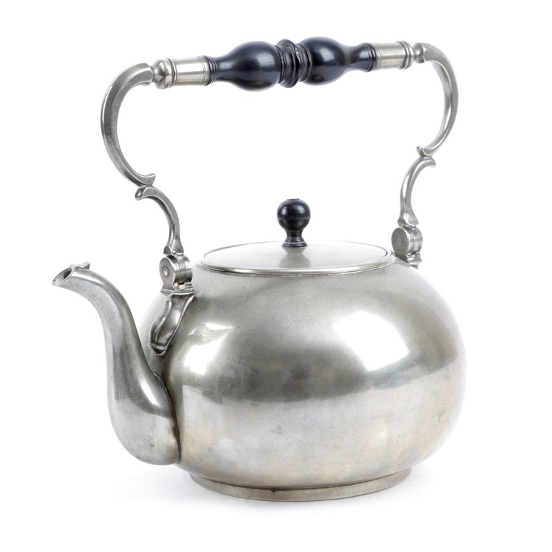 of plain spherical form, the double 'C' curve swing handle with a baluster turned ebonised centre, the lid with ebonised ball knop