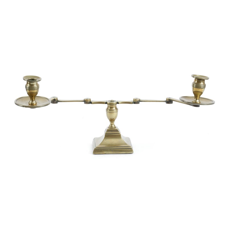 having a large pair of pivotal straight sided candle sockets with flared rim, on a dished drip-pan, with finger loop type handle attached to an adjustable bulbous centred branch, the circular stem with carry handle terminal and spreading circular weight base