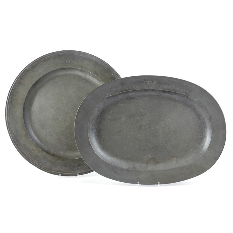 with ownership initials 'SD' and 'IR' above hallmarks to the rim, touchmarks to the underside of the rim, together with a George III oval charger, by John Townsend (1748-1801) (PS21), c.1760, the plain rim with a scrolling ownership monogram, touchmarks to the underside (2)