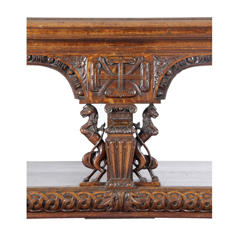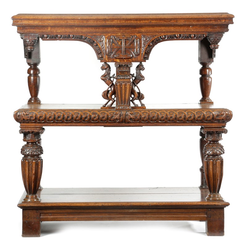 the top shelf with front leafy carved drop finials, supported by two turned rear supports, and a magnificent central front support carved with paired lion rampant centred by a fluted column and a scrolled ‘guild mark’, the second shelf again supported by turned rear columns and thick turned and fluted cup-and-cover front supports, the later lower shelf on block feet