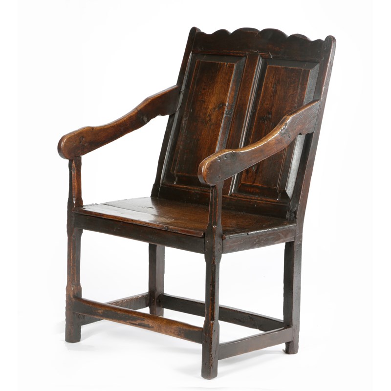 A WELSH OAK DOUBLE PANEL BACK OPEN ARMCHAIR