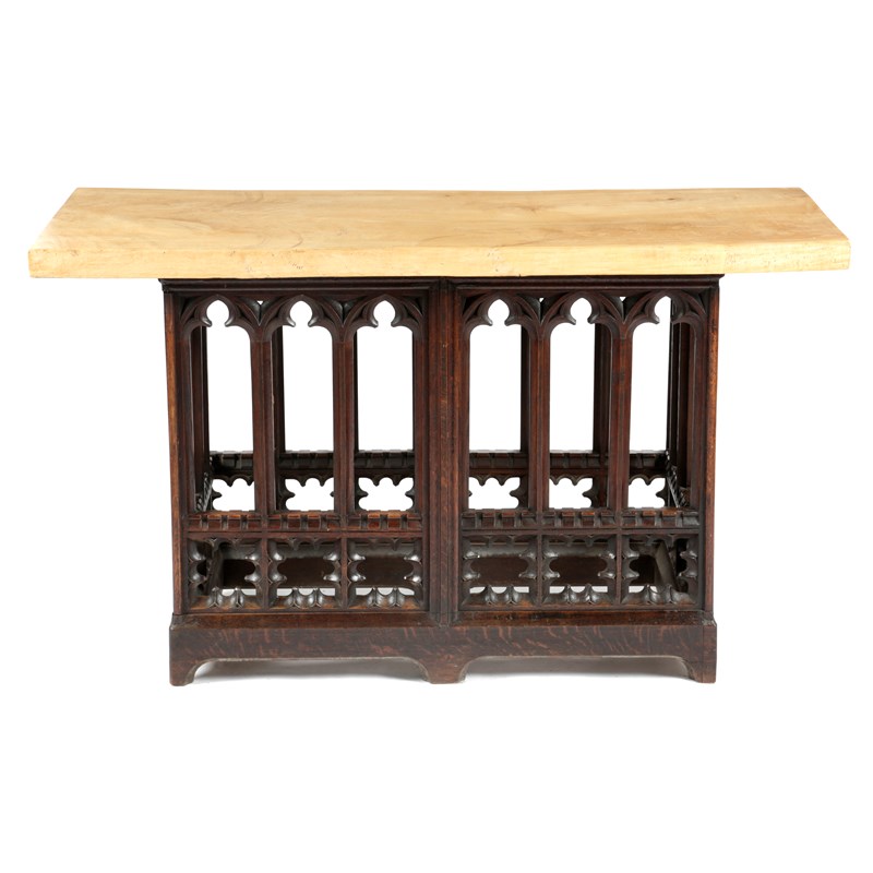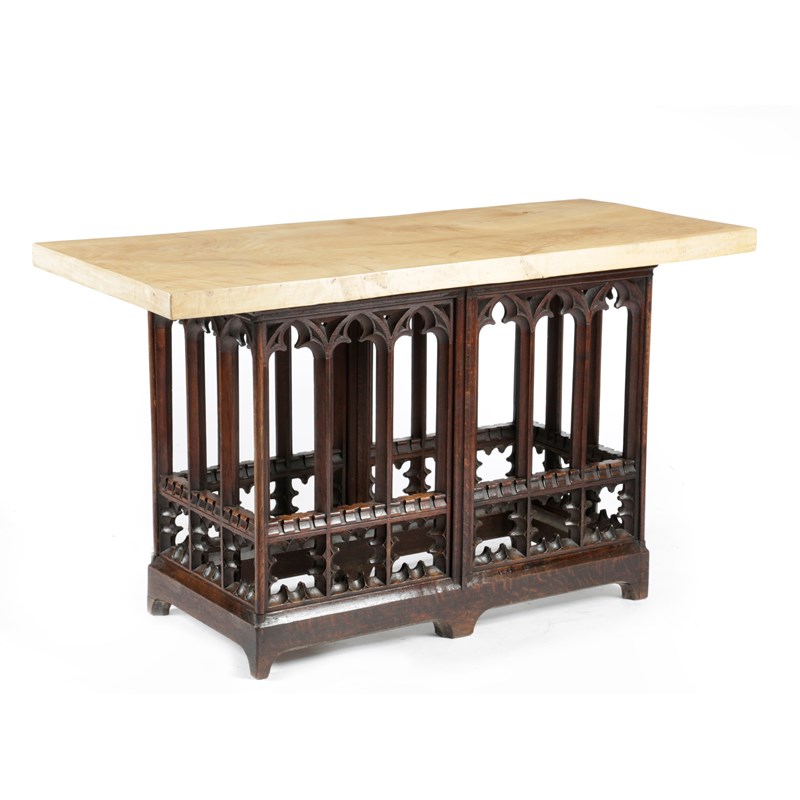 the later sycamore slab top above a base decorated with lancet arches
