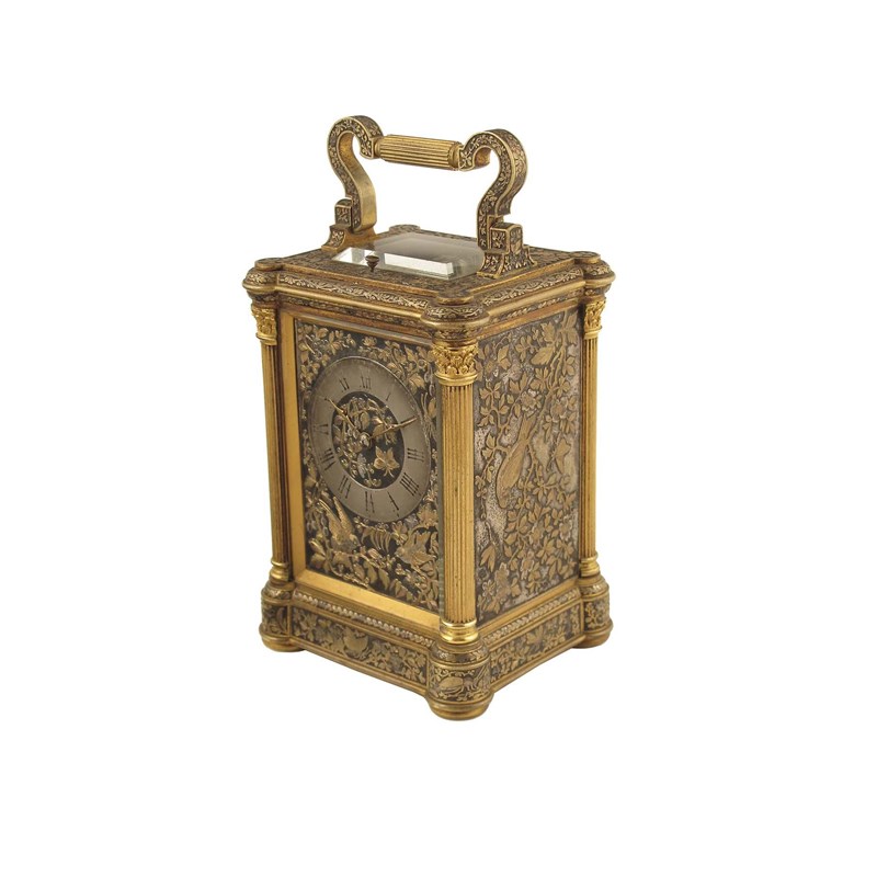 A panelled carriage clock, repeating movement, numbered 2877, lever platform, dial with faded signature of Connell, Cheapside, London, the dial, sides, back door and entire case decorated with silvered and gilt birds, butterflies and flowers against a dark ground, 6.2in (16cm) h.