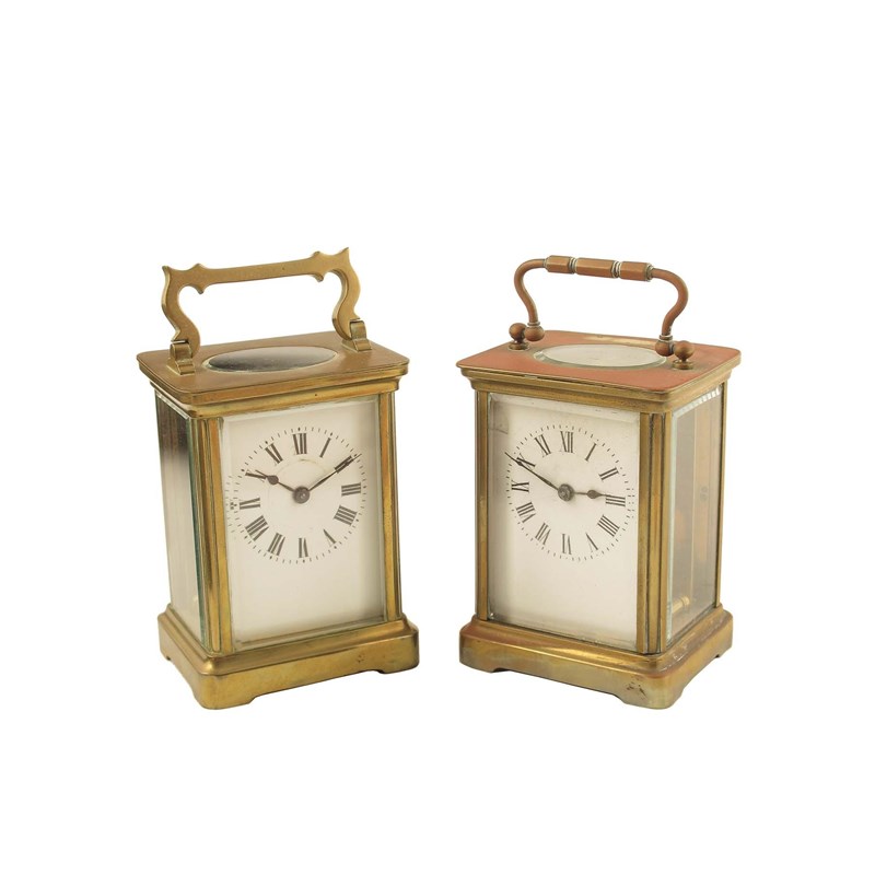 A carriage timepiece, cylinder platform, in a brass case, another with replaced lever platform and a travelling case. (3)
