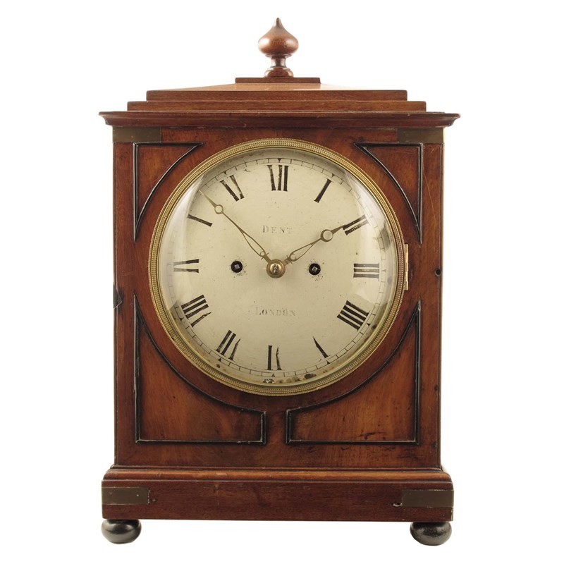 A mahogany bracket clock, with repeat, with ebonised beading, the twin fusee movement striking on a bell, the arched plates with riggle engraving to the back signed Mc Levin royal exchange LONDON, to a painted circular dial inscribed DENT, LONDON, to a cast beaded bezel, the case with brass corner mounts, a stepped top with later finial and pierced brass church window panels, 16.5in (42cm) h.