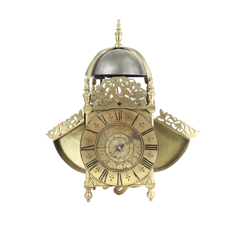 A striking winged lantern clock with alarum, 6.5 inch chapter ring, signed in the tulip engraved centre John Wilkins, alarm setting disc, the fluted pendulum mounted between the trains, the iron backplate mounted with the alarm train, hoop and spurs, in a case of typical posted frame construction, with dolphin frets, 15.75in (40cm) h.