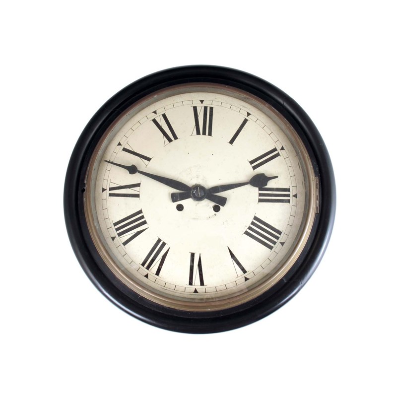 An ebonised wall clock, the lever escapement striking on a gong with a painted 12.75in dial, 15.75in dia.