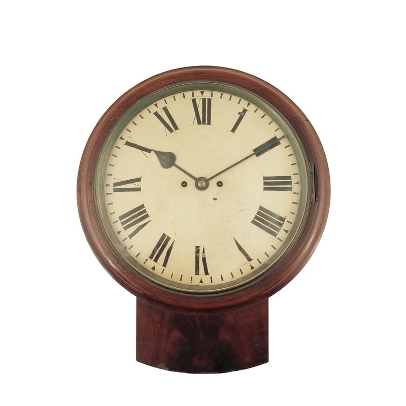 A mahogany and brass inlaid drop dial, with a single fusee between rectangular plates, re-painted 12 invh convex dial inscribed JOHN DAVEY, LONDON, cast brass bezel, glazed aperture to the drop, 20in (51cm) h.