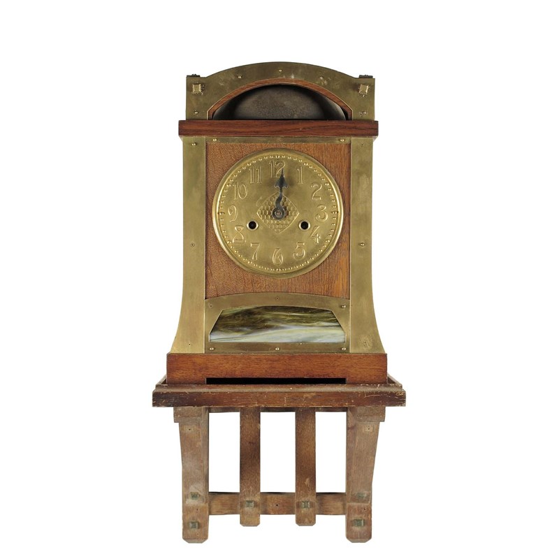 A German oak, brass and coloured glass 'Secessionist ' bracket clock, with bracket, the movement stamped with crossed swords trademark and 153/39, 150, striking on a bell housed in the arched top, an embossed brass dial, minute hand missing, 14.5in (37cm) h, the bracket, 11in (28cm) w. (2) Pendulum bob.