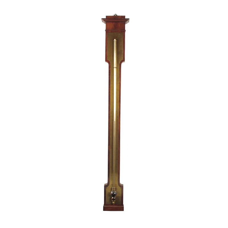 A French mahogany thermometer, with an applied moulded cornice above a brass dial inscribed L'Ing Chevallier, Opticien du Roi et des Princes, Vis-a-vis le Marche aux fleurs a Paris, marked with French colonial countries and Paris recorded dates, 41.25in (105cm) h.