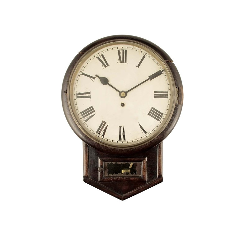 A stained soft wood cased drop dial, with a single fusee movement within shaped plates and a 12in painted dial, 20.5in (52cm) h. Pendulum and winding key.