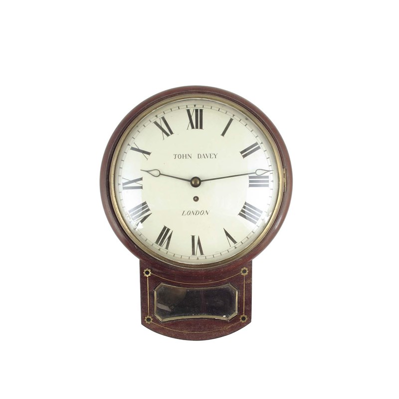 A mahogany drop dial wall clock, with a twin chain fusee movement striking on a bell within rectangular plates, signed Boxell, Brighton, 2724, with a 14 inch painted dial, cast brass bezel, plain drop, 22in (56cm) h.