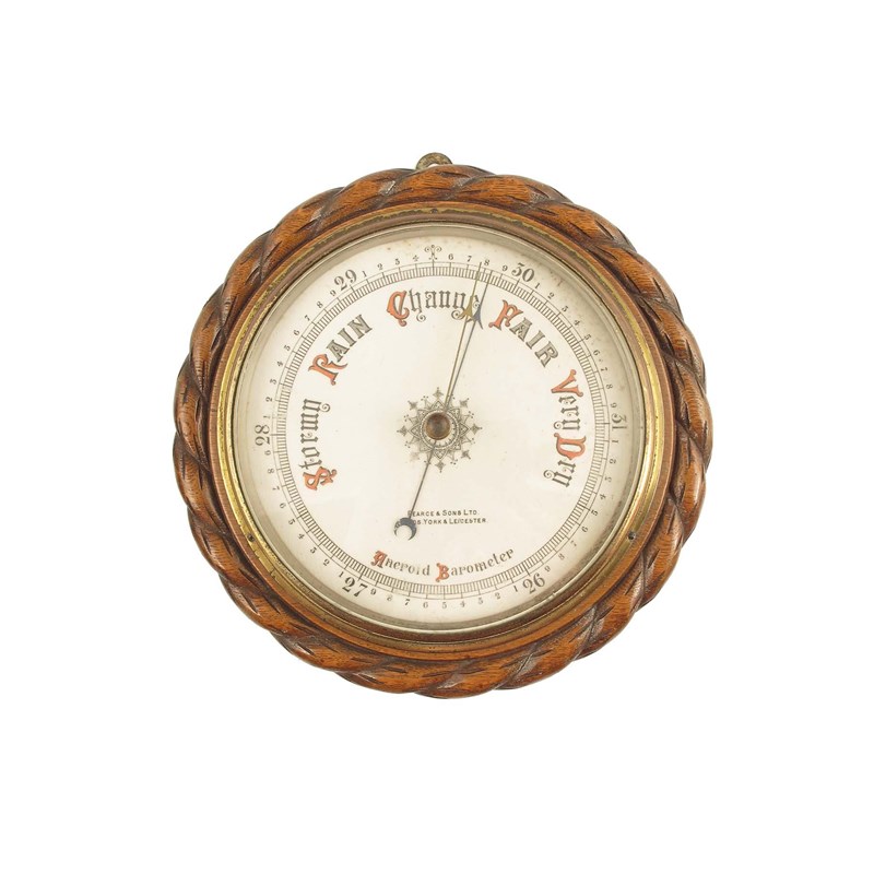 A carved oak 'rope' frame aneroid barometer, with a 7.5in ceramic dial, inscribed PEARCE & SONS LTD., LEEDS, YORK & LEICESTER, 11in (28cm) dia.