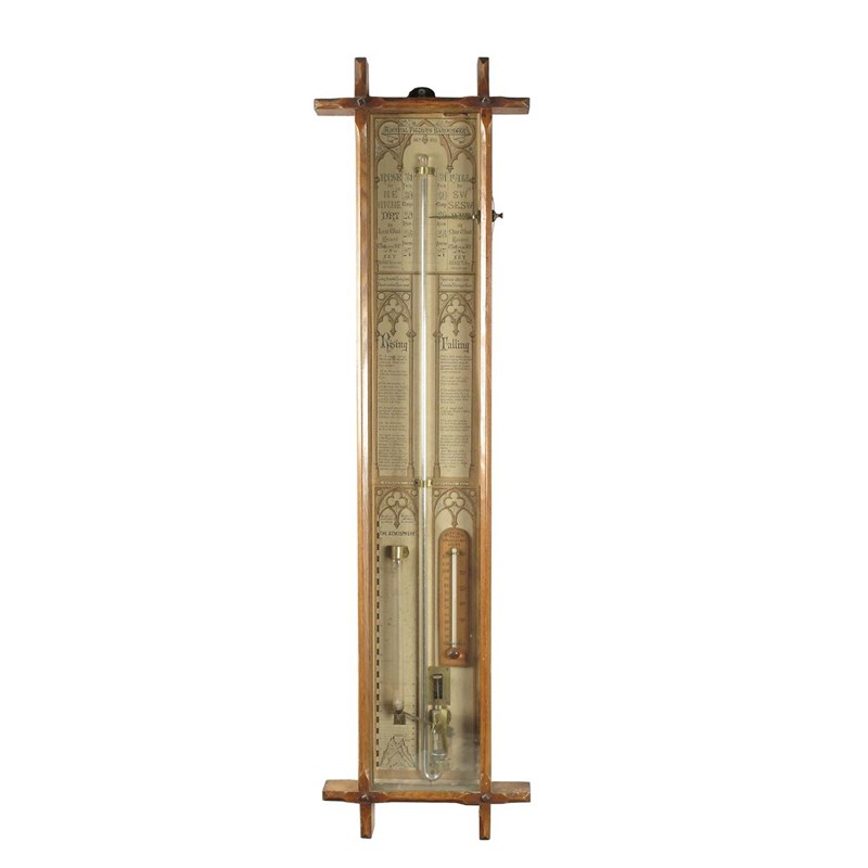 An oak cased Admiral Fitzroys barometer, with printed paper dials, brass marker to the right side, left one fallen to base, the thermometer marked MATHESON. MAKER TO THE ROYAL NAVY LEITH, 41in (104cm) h.