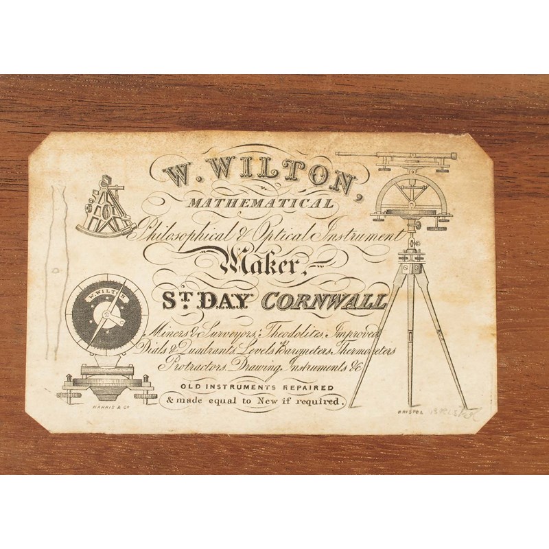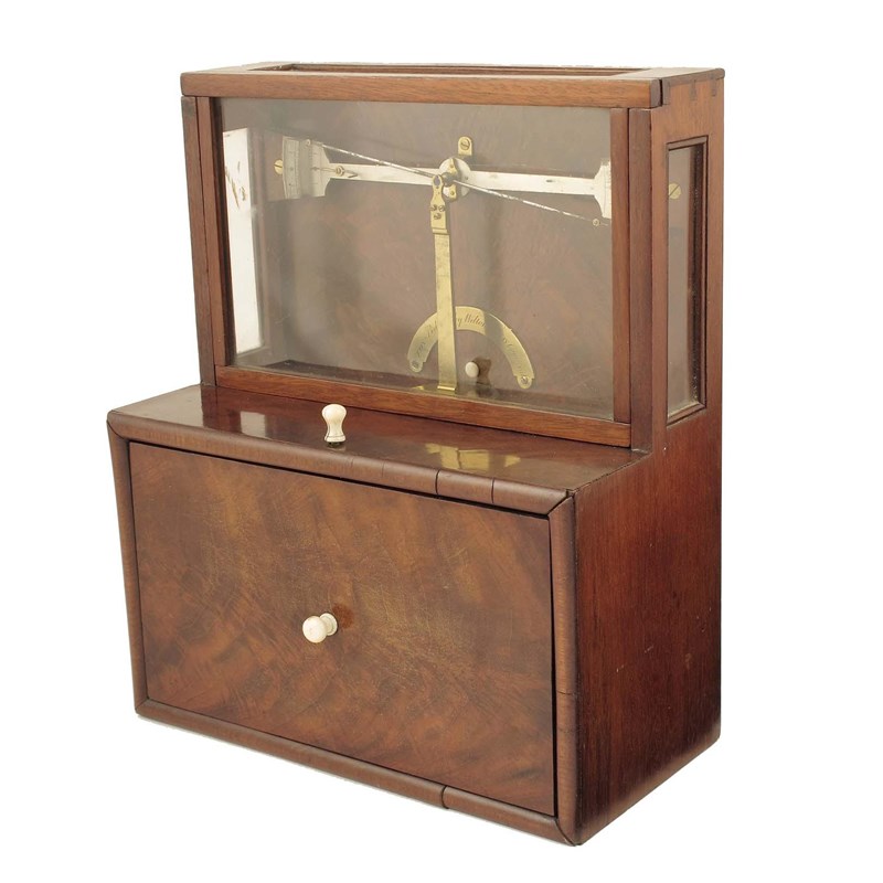 An early Victorian Fox's Balance by William Wilton, Cornwall, brass and silvered with marked scale either side, with curved brass plaque inscribed FOX's Balance by Wilton, ST DAY Cornwall, fitted in a mahogany case with a rising glazed from the base with a drawer, with printed trade label to reverse W.WILTON, MATHEMATICAL Philosophical & Optical Instrument Maker, ST DAY CORNWALL..., with ivory handles, the reverse with a brass needle and ivory scale marked 30-0-30, 12in (30.5cm) h.