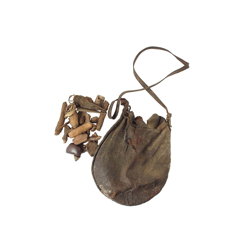 A South African Zulu shaman's leather bag, containing a collection of amuletic objects, vegetable and animal substances known as 'the Witch Doctor's bag', c.1920, 11in (28cm) h.