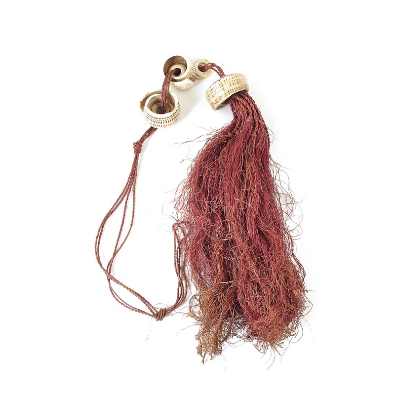 A south east Papua New Guinea conus shell currency bundle, tied with long strands of red dyed raffia, Gulf province, early 20th century, 44in (112cm) l.
