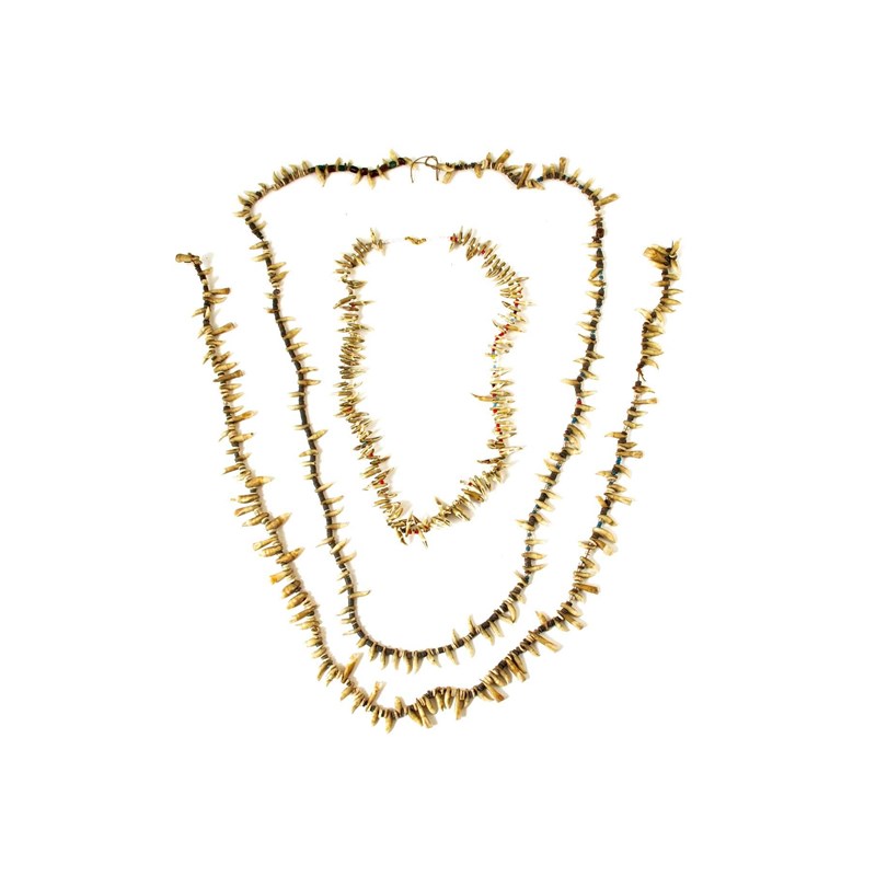 A Papua New Guinea flying fox teeth, glass bead and fibre necklace, Mountain peoples of the Fly River district, 1st half 20th century and two Pacific Admiralty Islands Kiribati long necklaces made from strands of human and porpoise teeth, late 19th century. (3)