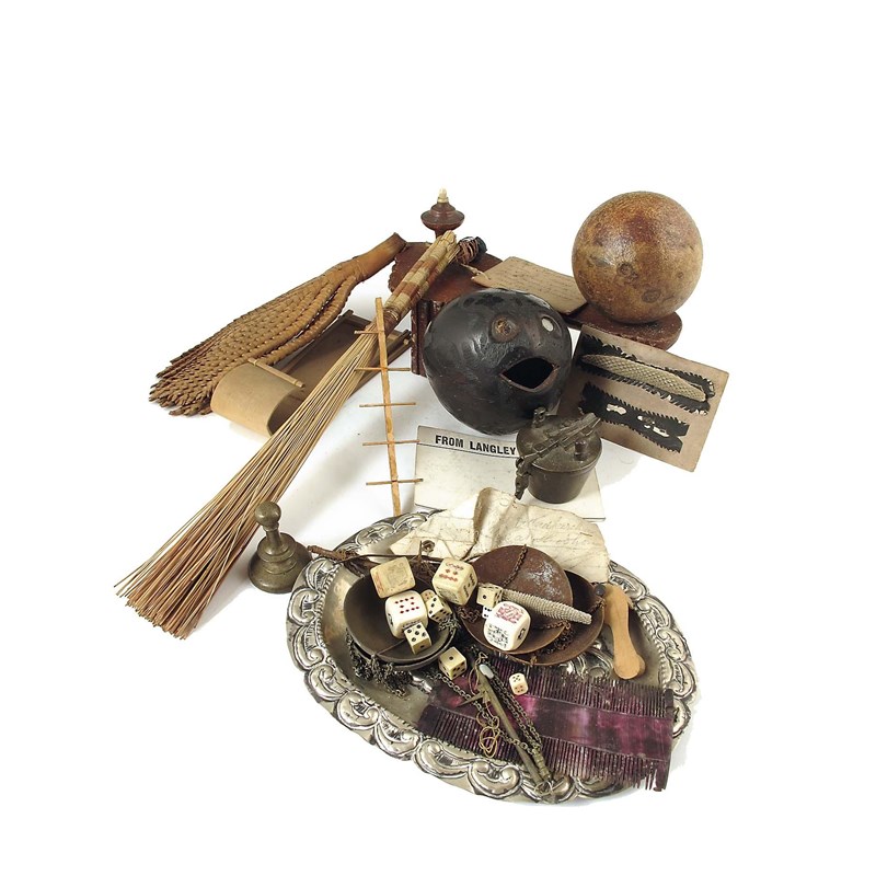 A collection of tribal items, including a 19th century Malay shoe (with old label), a carved coconut, other tribal items with labels and a collection of dice. (A lot)
