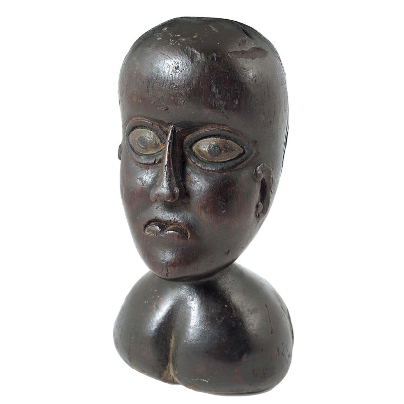 A carved wood bust, with a dark patina and with painted eyes, 19th century, 6.75in (17cm) h.