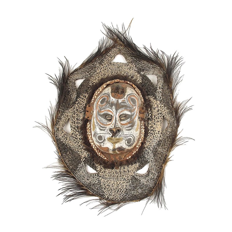 A Papua New Guinea, Sepik river wood and polychrome spirit mask, with clay, shell and hair border to a woven reed outer border with feathers, 25in (63.5cm) h.