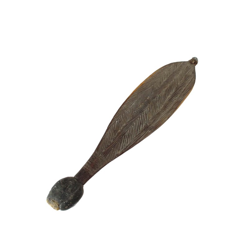 An Australian Aboriginal hardwood spear thrower Woomera, etched with an abstract wave design to both sides, one end with a kangaroo claw the other end with a stone set in a resin handle, Western Desert, 19th century, 21.25in (54cm) l.