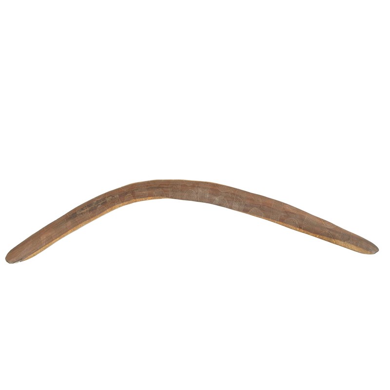 An Australian Aborigine boomerang, with incised decoration, 34in (86.3cm) l.