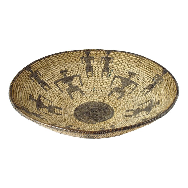 A south west Native American Indian Pima basket, decorated with thirteen abstract life forms, willow and devil claw, 19th century, 12.5in (32cm) dia.