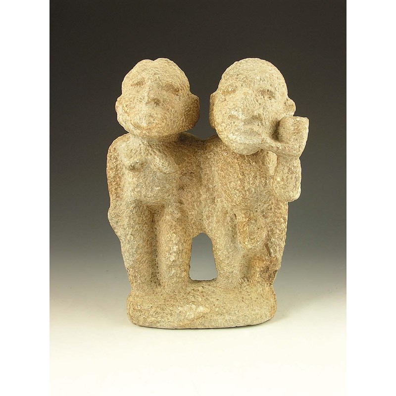 A carved stone group of a naked man and a woman, he smokes a pipe, possibly South American,14in (35.2cm) h, 10in (25.3cm) w.