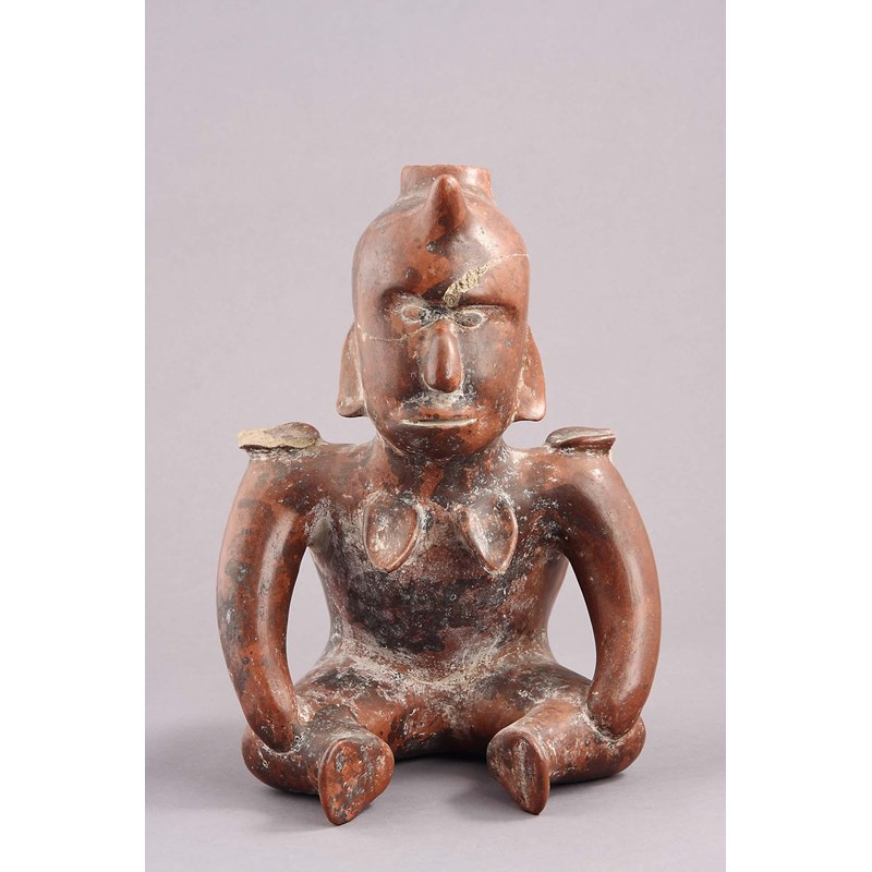 A pottery seated figure, with arms resting on knees, 12in (31cm) h.